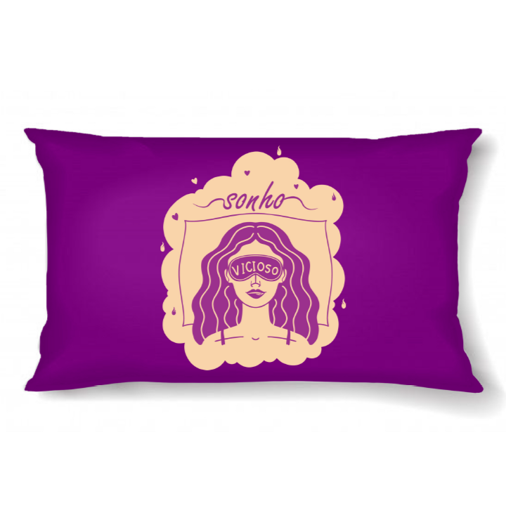 A fronha Travesseiro Curioso traz o roxo intenso da paixão quieta e o desenho de uma menina girly mordendo levemente os lábios — delicada, bonita e cheia de intenção.